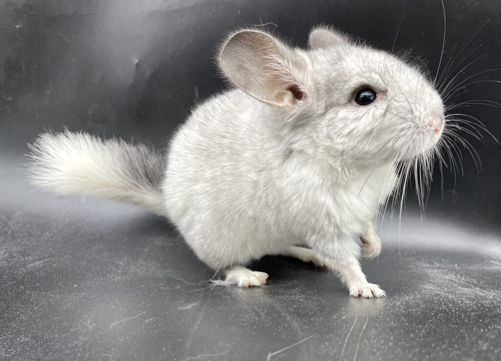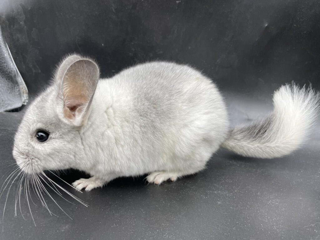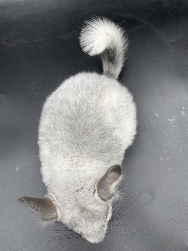 ホワイトの身体に全体的にシルバーに見えるグレーの差し毛が美しい子です💓 尻尾の付け根は濃いグレーが入っています。 ぴょこぴょこ元気いっぱいです🌟