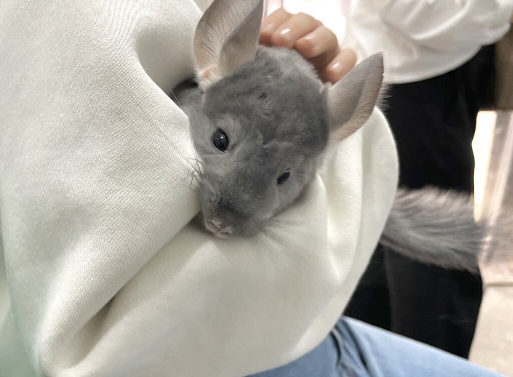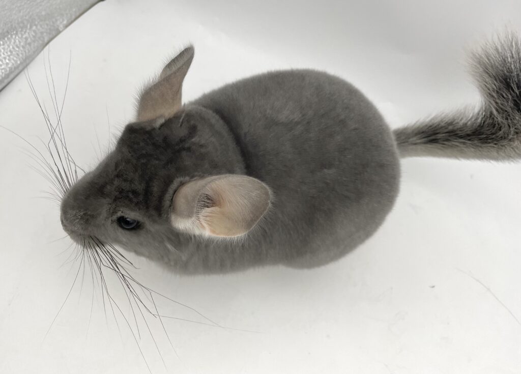 | 岡山の提携ブリーダー しっぽのこころさん▶https://www.instagram.com/shippo.no.kokoro/ からやってきたチンチラちゃんです。 バイオレット三つ子のうち女の子姉妹が当店入店しました🎀 姉妹のうちの体の大きい子の方です♪ 艶々光沢あるバイオレット キラキラな毛並み☆彡 人懐っこく、すぐ寄ってきてくれる元気いっぱいな子 現在、抱っこも暴れず良い子にしてくれます。 安心サイズです😊